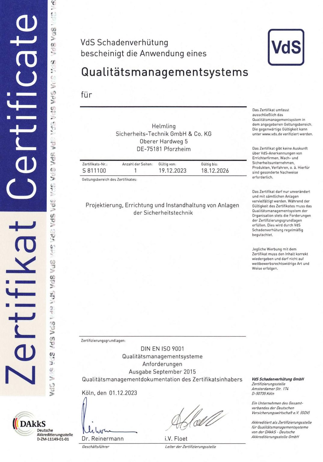 VdS Zertifikat DIN ISO 9001