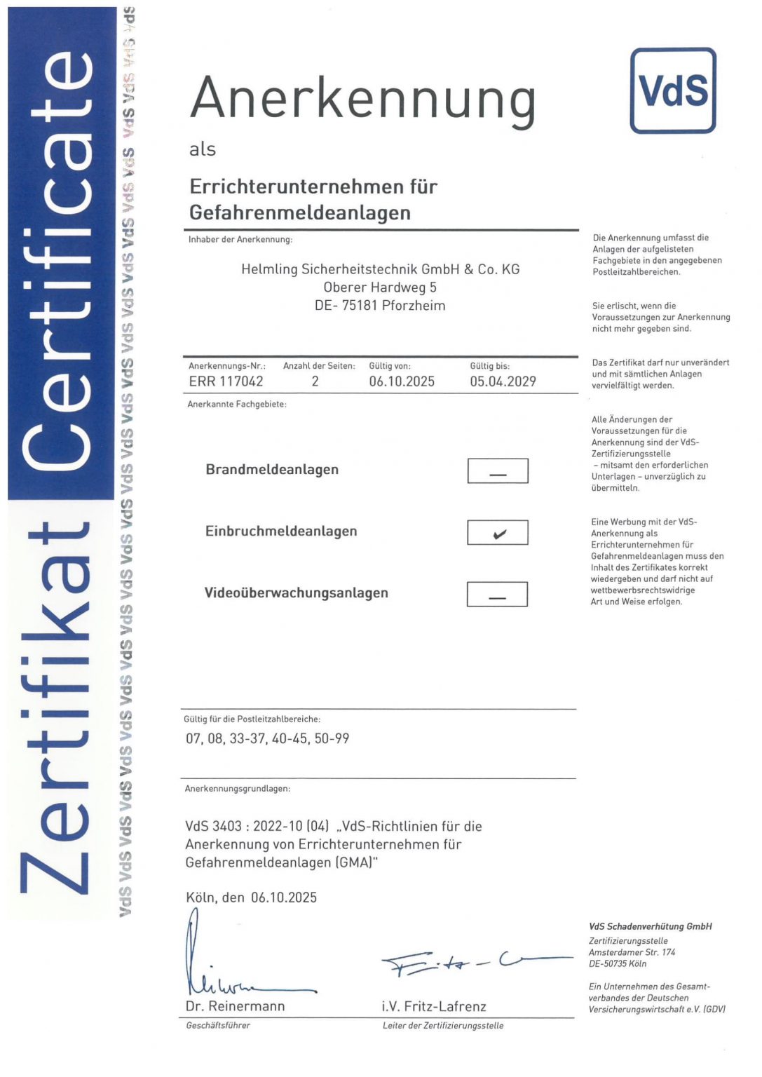 VdS Zertifizierung als geprüftes Errichterunternehmen für Ausführungen nach VdS Vorschriften